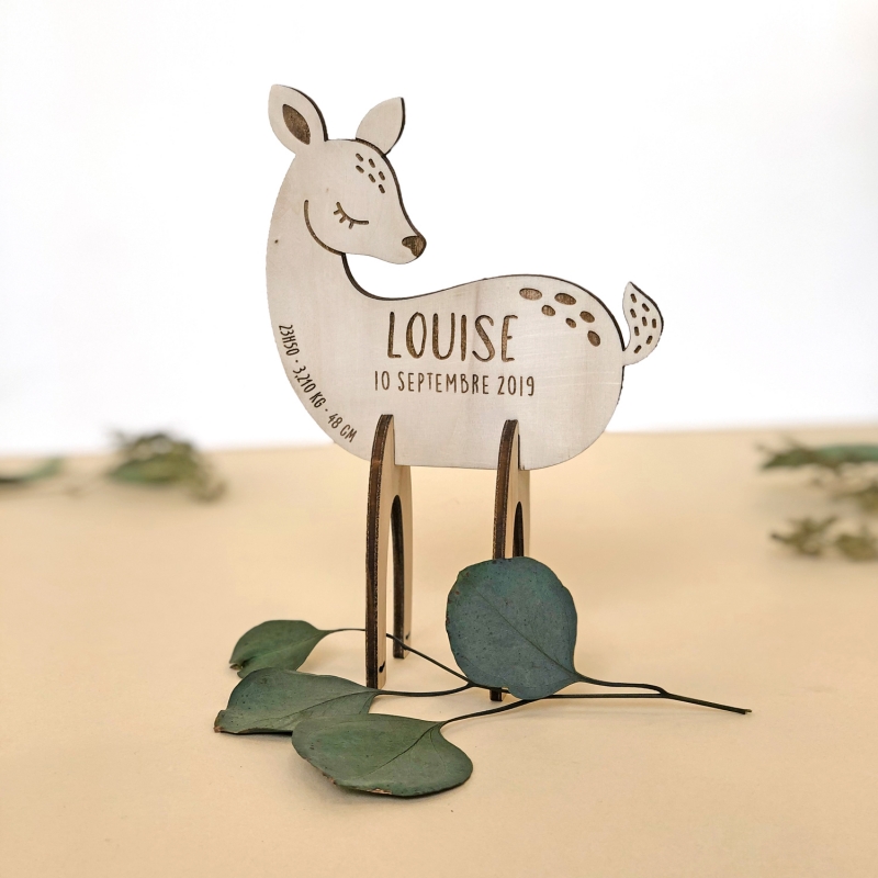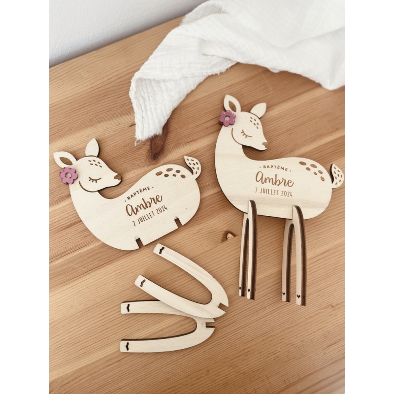 Personnalisez de jolies invitations anniversaire en bois en forme de petit faon. Envoyées sous forme de petit kit, vos convives vont adorer l'idée de donner vie à l'animal en lui mettant ces pattes.