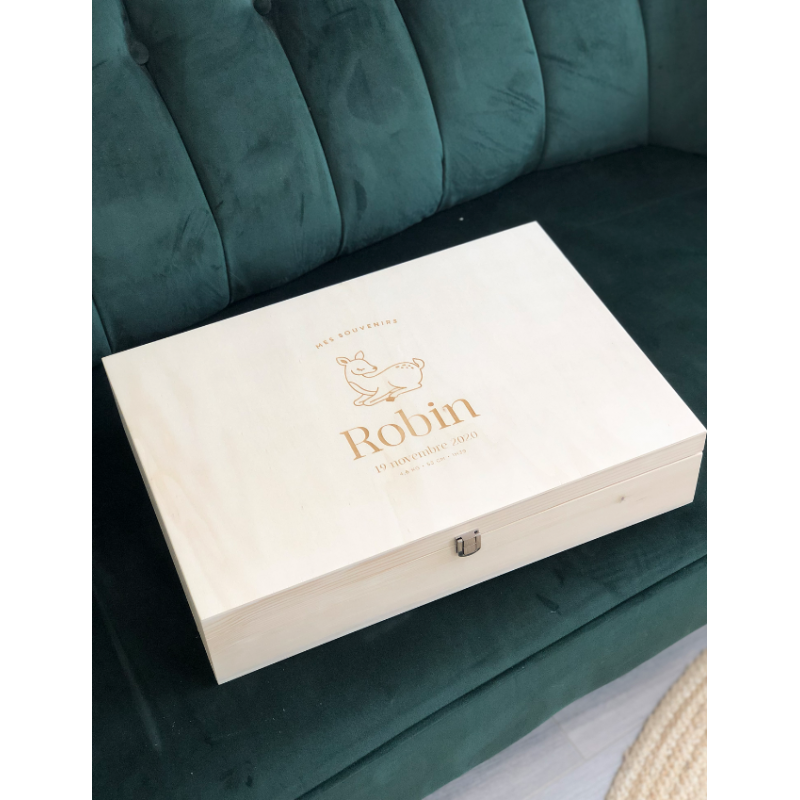 Grâce à ce joli coffret en bois, vous pourrez conserver précieusement les premiers vêtements et accessoires de votre bébé. Personnalisez avec le prénom de votre enfant et ses informations de naissance, cette jolie boîte sera un souvenir unique de ces premiers instants de vie. Le modèle faon sera parfait pour les amoureux de la nature et de la forêt.