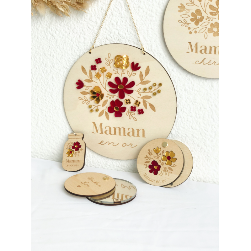 Offrez-lui un cadeau pour célébrer son rôle de maman : un joli miroir de poche. Ce modèle vous plaira pour son design fleuri et printanier avec ses 3 petites fleurs en gravure ou en plexiglas de couleur (en option). À l'arrière, vous pouvez écrire le ou les prénoms des enfants pour en faire un cadeau personnalisé et unique.