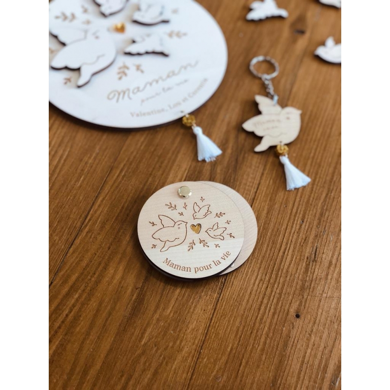 Que ce soit pour la fête des mères ou son anniversaire, ce miroir de poche sera un joli cadeau à offrir à votre maman ! Personnalisez le recto du miroir avec la mention de votre choix (cf menu déroulant), ainsi qu'avec le nombre d'oiseau(x) selon le nombre d'enfant (1 à 3). Au verso, inscrivez le ou les prénoms de votre choix.