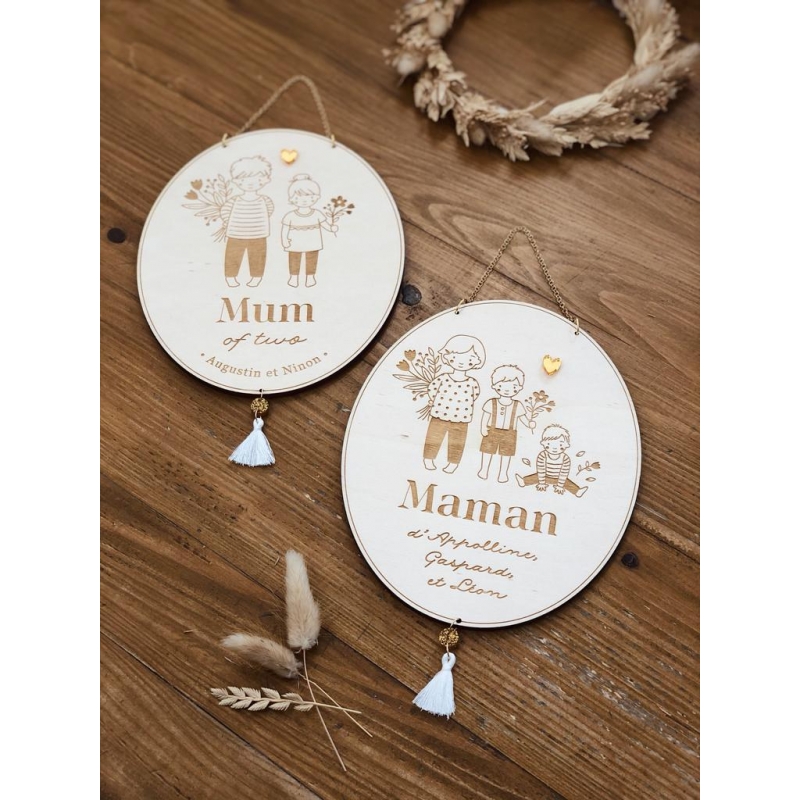Vous cherchez un cadeau original et unique pour une maman ? Cette médaille en bois sera parfaite ! Vous pouvez choisir le portrait de chacun des 3 enfants selon nos dessins, rajouter une petite mention qui corresponde à la maman (Mum of three par exemple) et signer la décoration avec les prénoms des enfants.