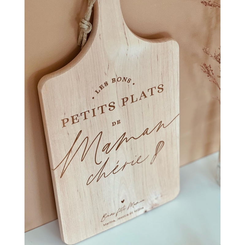 À l'occasion de la fête des mères ou de son anniversaire, offrez un cadeau original et utile à votre maman : une planche à découper en bois. La planche est personnalisable avec un petit surnom (exemple : Maman d'amour), ainsi que la signature de votre choix (exemple : "Bonne fête Maman" ou "On t'aime fort", Gaspard et Auguste).