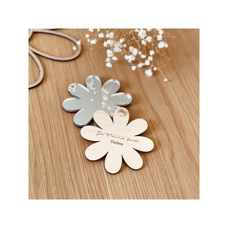 Le miroir de poche a une ouverture coulissante, il est maintenu fermé par un aimant afin de bien le protéger des chocs. Le produit est gravé à l'arrière avec un message et un ou plusieurs prénoms.
