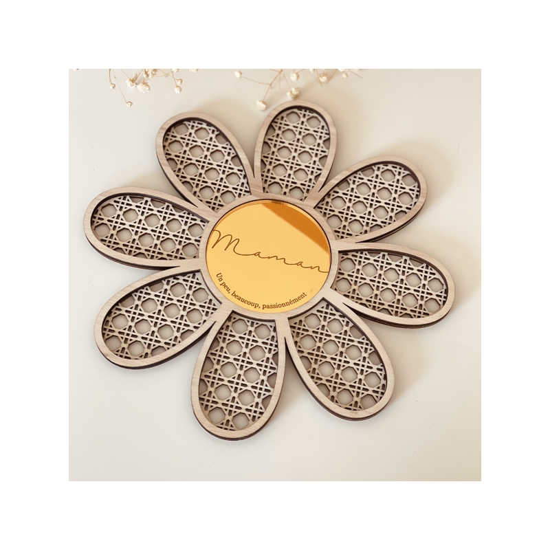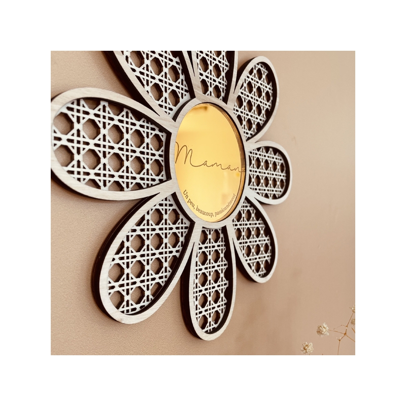 Offrez à votre maman un joli miroir en forme de marguerite réalisé avec un motif cannage. Grâce à ses couleurs passe-partout en plexiglas miroir et bois brut, il s'intègrera facilement dans toutes les décorations. Le coeur de la fleur est personnalisable avec un mot (par exemple : "Maman") et le ou les prénoms des enfants pour un cadeau unique et 100% original !