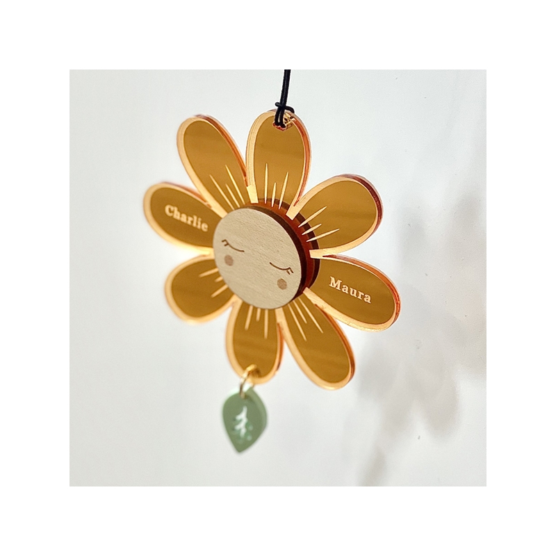 Vous cherchez un cadeau insolite et complément original ? Laissez-vous séduire par ce bijou de voiture en forme de marguerite. Le modèle Mère-veilleuse représente une mère qui veille sur ses enfants. Le(s) prénom(s) sont finement gravé(s) sur chaque pétale afin de laisser passer la lumière et ainsi mettre en valeur le ou les prénoms.
