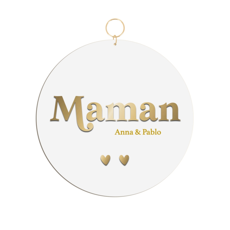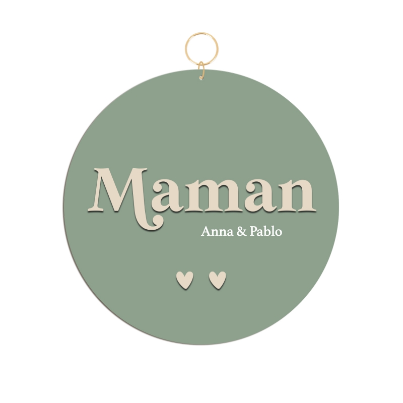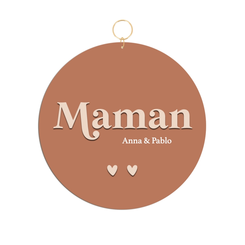 Joli médaillon décoratif à offrir à l'occasion de la Fête des mères. Vous allez adorer son association bi-couleurs en terracotta et beige. Sur le médaillon, le mot "Maman" est joliment écrit en relief et dans une police rétro. Les prénoms des enfants sont personnalisables, ainsi que le nombre de coeurs qui les représentent de manière symbolique.
