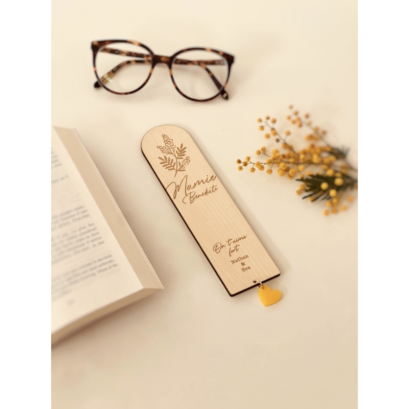 Offrez un petit cadeau original et utile à votre maman ou à celle de vos enfants : un marque-page personnalisable. Le modèle Mimosa vous plaira pour son illustration printanière et travaillé et son petit coeur pendant en plexiglas. Un joli cadeau pour une maman qui aime lire.