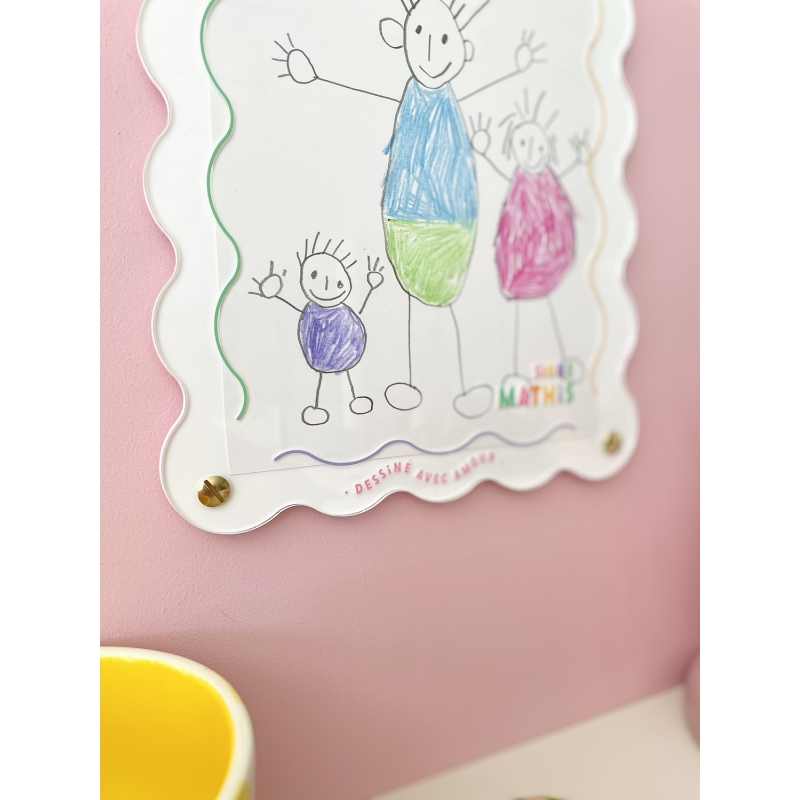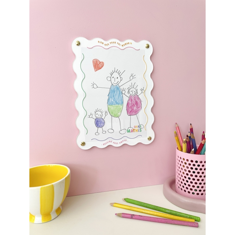 Ce joli cadre à dessin mural transforme un simple dessin d’enfant en une oeuvre à chérir. Son design à la fois épuré et coloré mettra parfaitement en valeur chaque trait du dessin. Le cadre à dessin est personnalisé avec le prénom de l'enfant pour en faire une décoration unique et un cadeau parfait pour la Fête des mères.