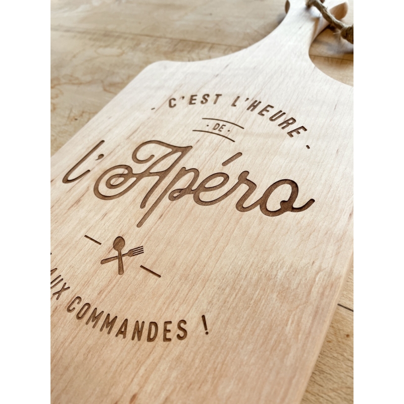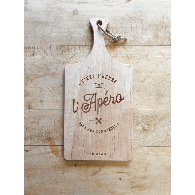 Pour la fête des pères ou un anniversaire, offrez une planche à découper en bois avec l'inscription "C'est l'heure de l'apéro, papa aux commandes !". Un cadeau original et utile qui plaira beaucoup aux papas adaptent des apéros !