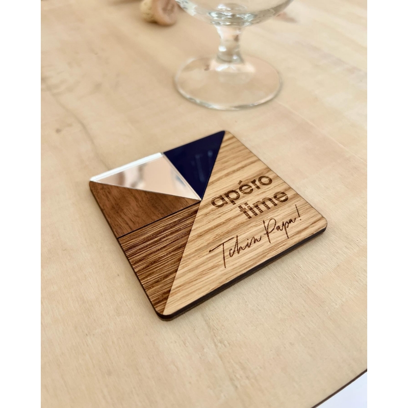 Lot de deux dessous de verre style tangram à offrir à un papa. Un cadeau original et utile qu'il pourra utiliser lors d'un apéritif. Vous allez adorer son design masculin et graphique avec son association de matières et de couleurs qui donneront du cachet aux dessous de verre.