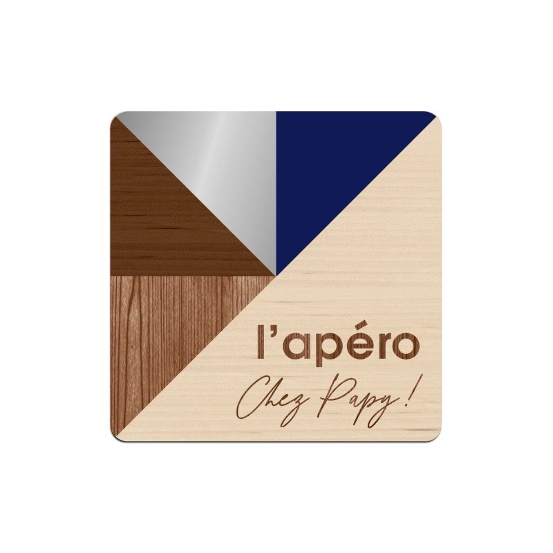 Dessous de verre réalisés en bois plaqué érable ou chêne (au choix), plexiglas miroir argent et bleu nuit.