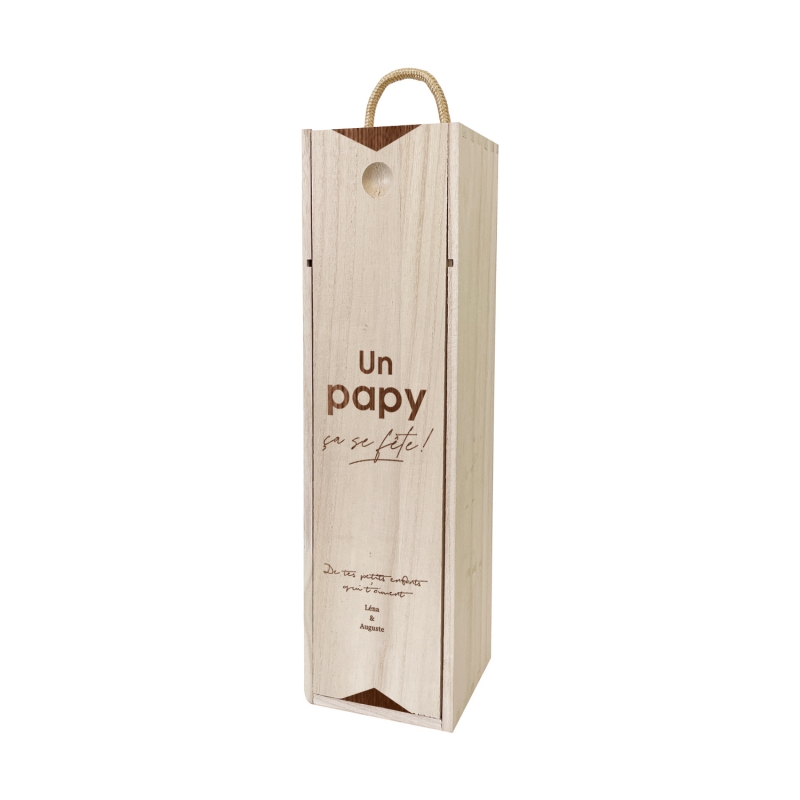 Vous souhaitez offrir une bouteille de vin à votre papa ? Ce coffret en bois personnalisable sera parfait pour en faire un cadeau original et unique ! La caisse est finement gravée avec la mention "Un papa ça se fête !", ainsi qu'un petit mot personnalisable et le ou les prénoms de ses enfants. Un coffret qu'il pourra conserver longtemps en souvenir de cet événement !