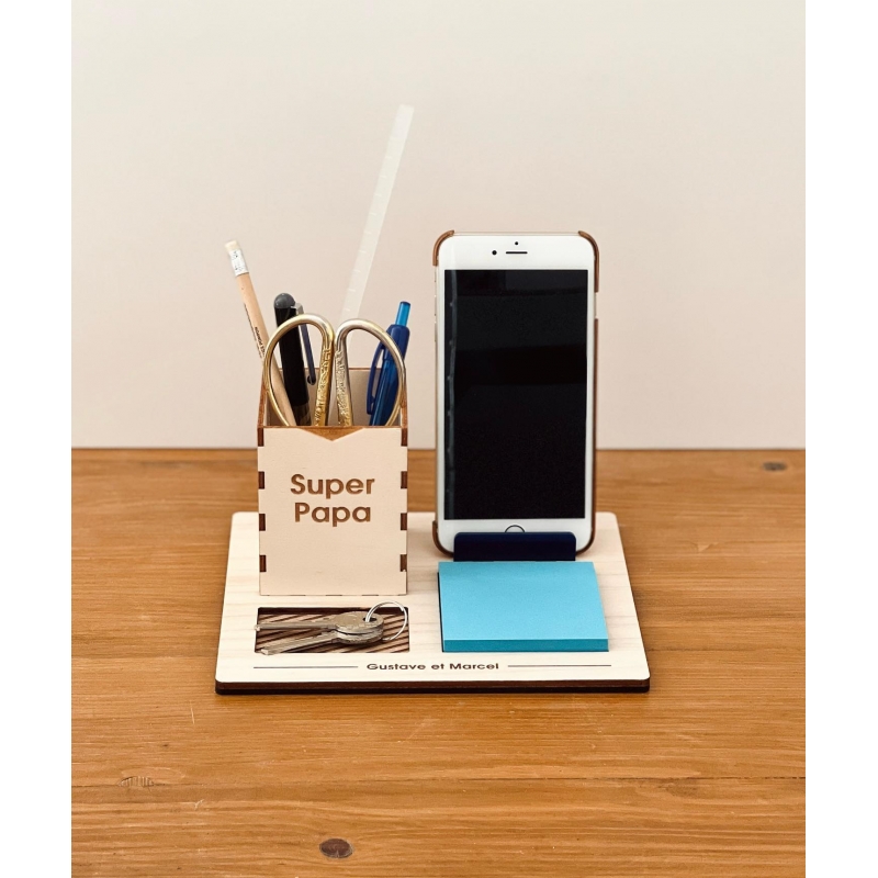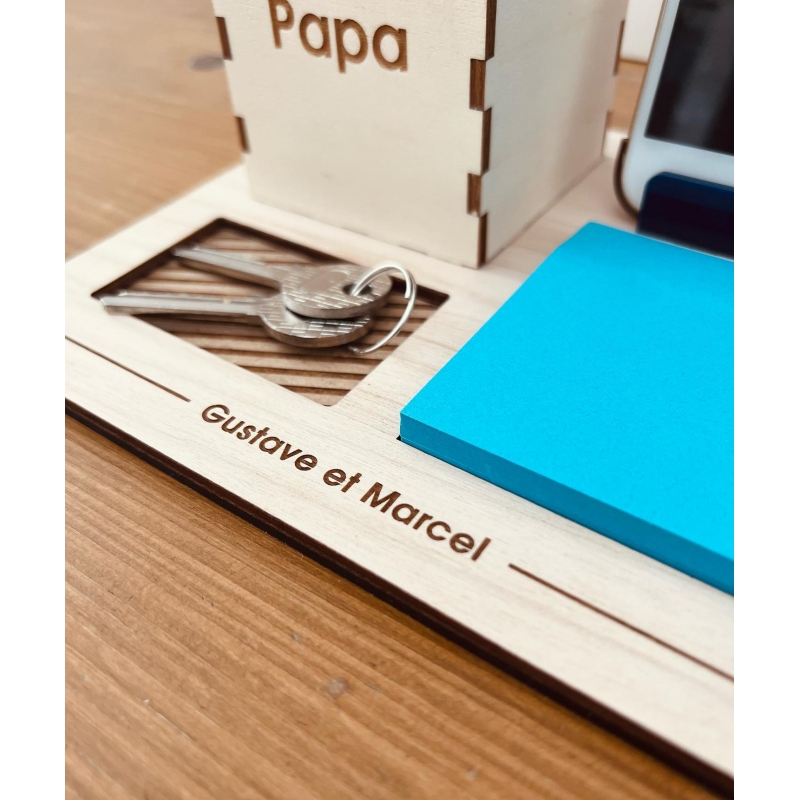 L'organisateur de bureau est un cadeau original dont le papa pourra se servir chaque jour au bureau. Un cadeau utile aux lignes et couleurs masculines avec le ou les prénoms de ses enfants gravés sur le socle, tel un petit clin d'oeil. L'organisateur en bois sera parfait à offrir à la fête des pères ou pour son anniversaire.
