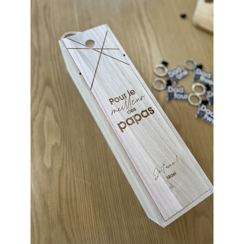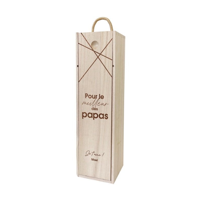 Découvrez notre caisse de vin en bois à personnaliser, le cadeau idéal pour célébrer la fête des pères. Le couvercle est personnalisable avec un petit mot et le ou les prénoms des enfants pour en faire un cadeau unique et significatif. Faites de la fête des pères un moment inoubliable en offrant ce coffret et une bonne bouteille de vin, un cadeau qui sera apprécié et chéri pendant des années.