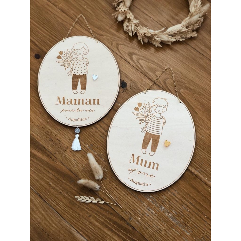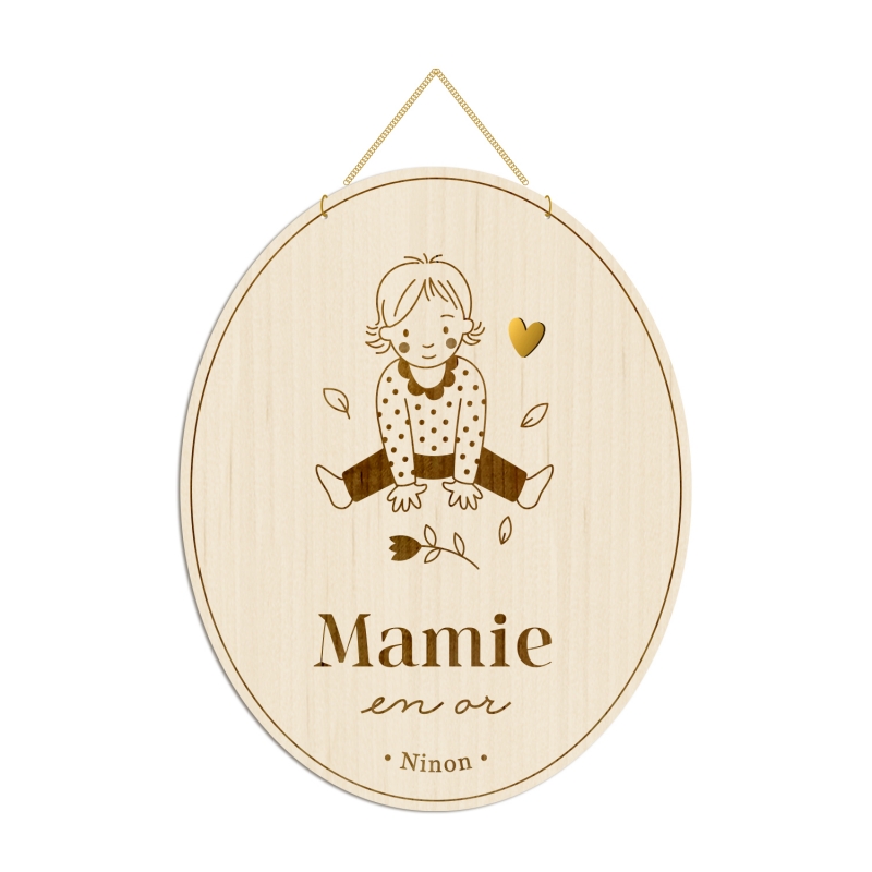 Gâtez votre grand-mère avec cette adorable décoration en bois gravée d'une douce illustration de son petit enfant qui lui offre une fleur. Grâce à sa petite chaînette dorée, votre mamie pourra suspendre ce joli cadeau au mur : un petit clin d'oeil quotidien de son petit enfant d'amour. Choisissez le dessin qui ressemble le plus à l'enfant et sa tranche d'âge parmi notre sélection.
