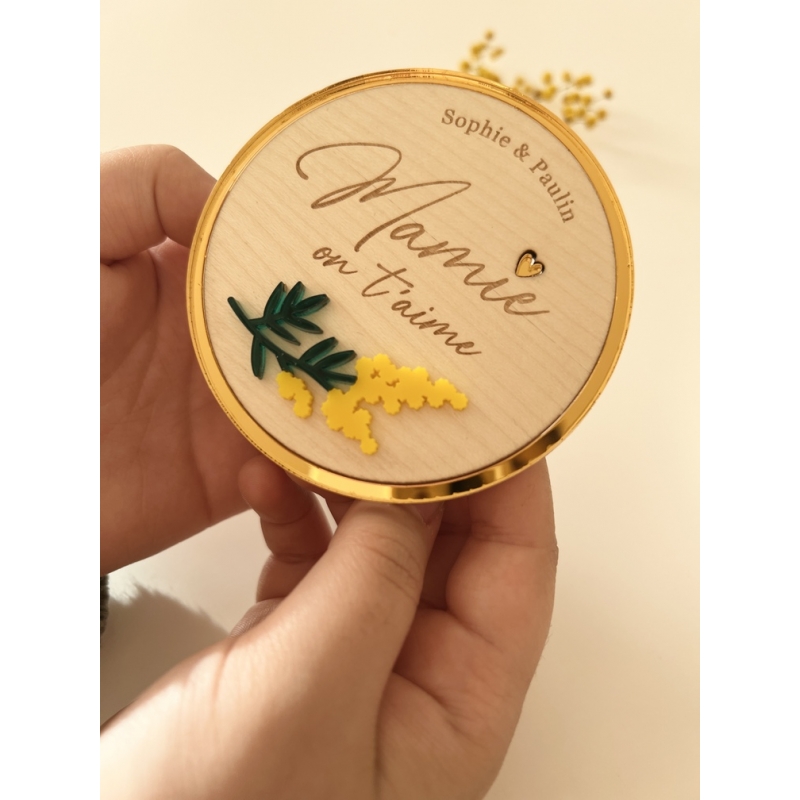 Offrez un cadeau unique et personnalisé à votre Mamie lors de la fête des grand-mères avec ce magnet en bois gravé. Fabriqué à partir de bois plaqué, ce magnet en bois est non seulement durable mais aussi élégant avec son brun de mimosa et son coutour en plexiglas colorés. Vous pouvez personnaliser ce magnet avec le message de votre choix, créant ainsi un cadeau sentimental !
