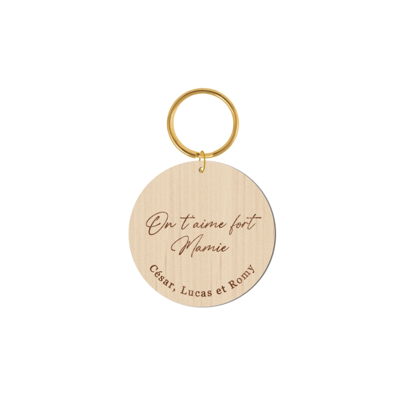 Offrez à votre mamie un porte-clés en bois personnalisé avec les prénoms de ses petit-enfants. Au recto est finement gravé la douce citation "Une maman formidable donne toujours une mamie exceptionnelle" ; et au verso faites inscrire un petit message et les prénoms des petit-enfants.