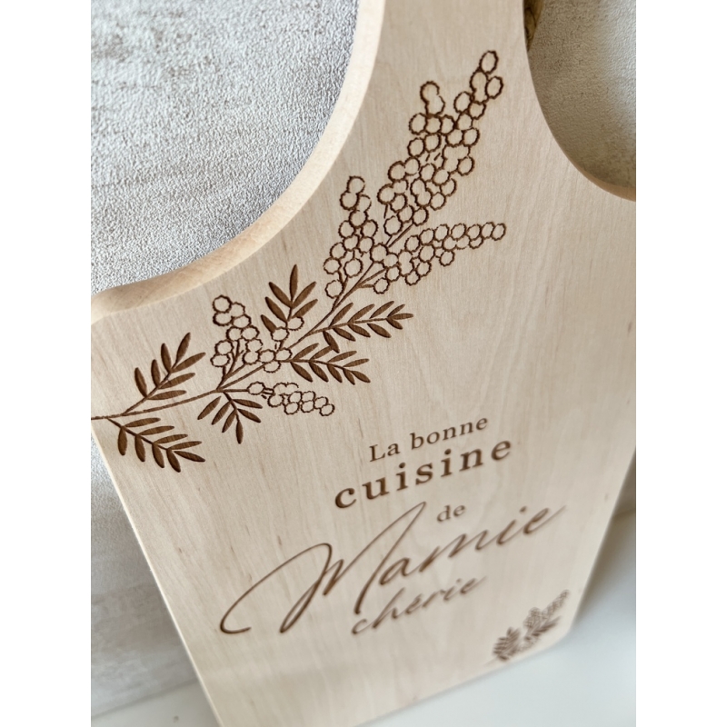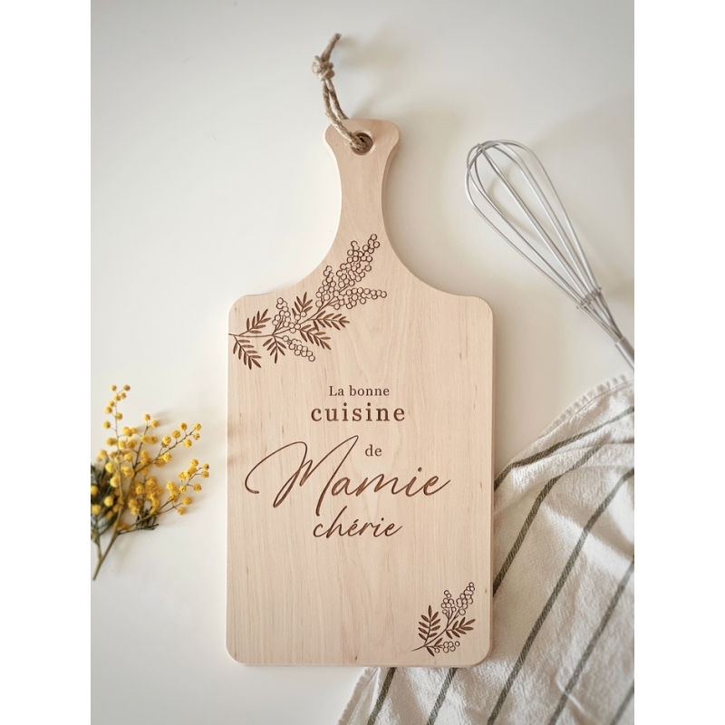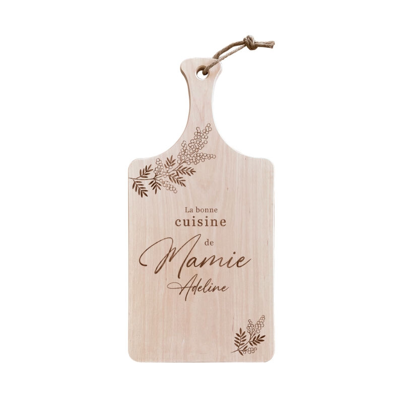 Offrez à votre grand-mère un cadeau unique et pratique avec notre planche à découper en bois personnalisée. Fabriquée à partir de bois d'aulne, cette planche à découper est solide, durable et parfaite pour toutes les préparations culinaires. Le design gravé avec des fleurs de mimosa est non seulement joli, mais ajoutera une touche personnelle à n'importe quelle cuisine.