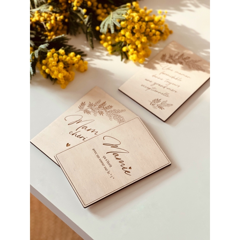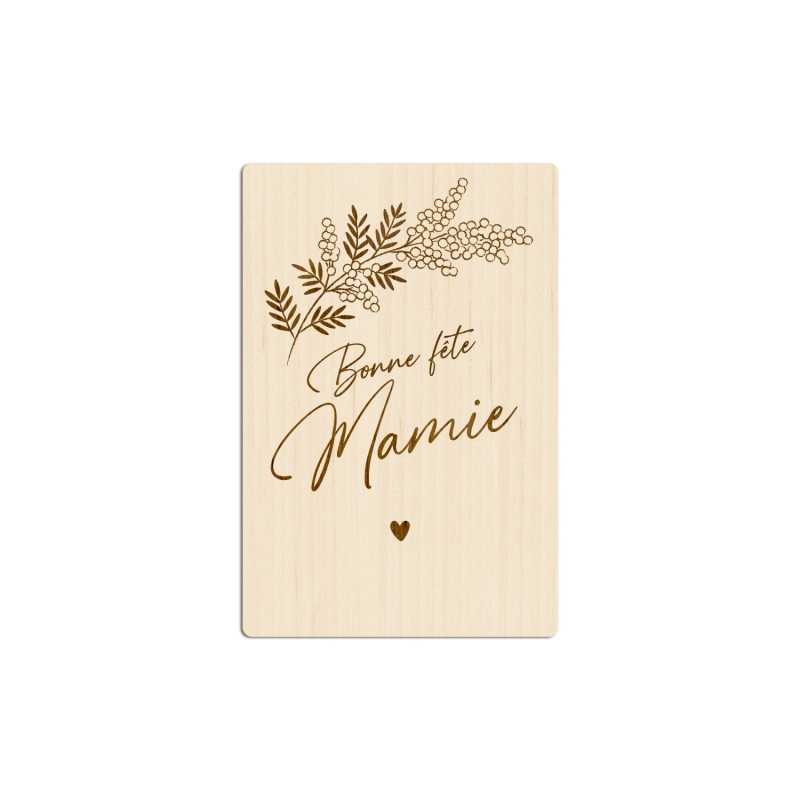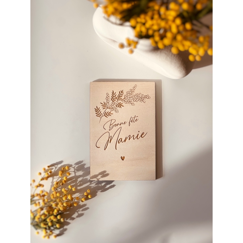 Célébrez la fête des grand-mères en lui offrant un cadeau original : une carte postale en bois. Au recto, le message "Bonne Fête Mamie" ou "Mamie chérie" est finement gravé et est mis en valeur grâce à l'illustration de fleurs de mimosa ; et au verso, vous pouvez lui écrire un texte 100% personnalisé (en option). Cadeau unique, original et écologique.
