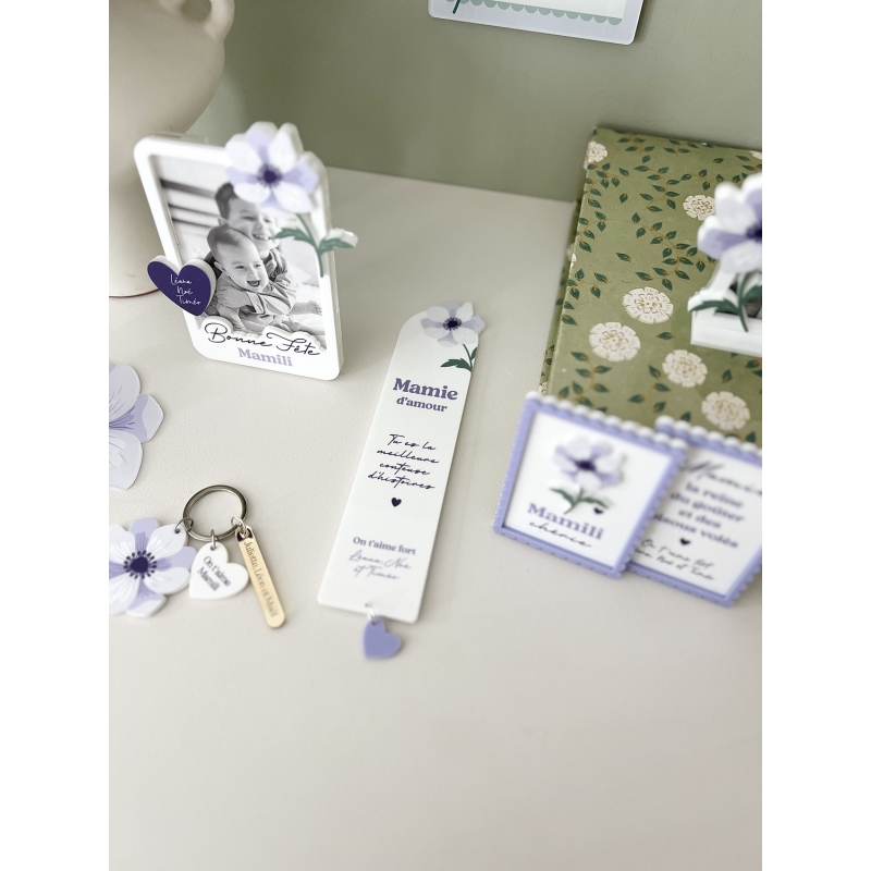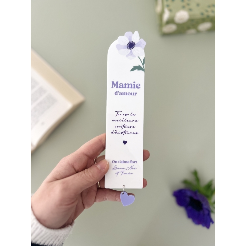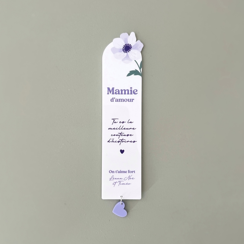 Offrez un joli marque-page en plexiglas pour la fête des grand-mères ! Personnalisable avec le surnom de mamie ou la mention "Mamie chérie" et les prénoms de ses petits-enfants, c'est un cadeau utile qu'elle aura plaisir à utiliser à chaque lecture. Ce modèle en plexiglas blanc vous plaira pour son design délicat et raffiné avec ces jolies anémones blanches et violettes.