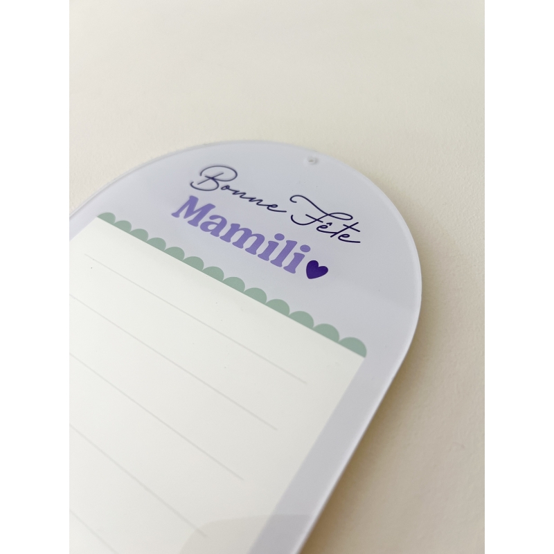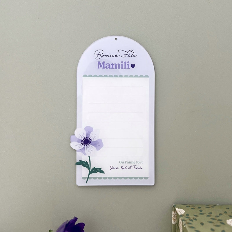 Offrez un joli tableau mémo effaçable pour la fête des grand-mères. Ce modèle plaira beaucoup à votre mamie avec son illustration d'anémone violette et ses couleurs douces et printanières. Le tableau mémo est en plexiglas, ce qui permet d'écrire dessus des mémos et pense-bêtes grâce à un feutre Velleda et s'efface facilement à l'aide un chiffon sec.