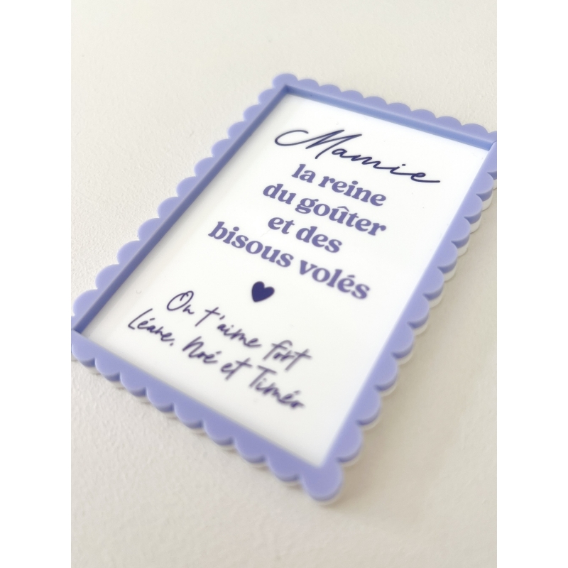 Offrez à votre Mamie un joli magnet avec une citation inscrite dessus et les prénoms de ses petit-enfants adorés. Vous avez la possibilité de choisir entre "Mamie fournisseur officiel de câlins et de gâteaux", "Mamie la reine du goûter et des bisous volés" ou d'écrire votre propre citation.