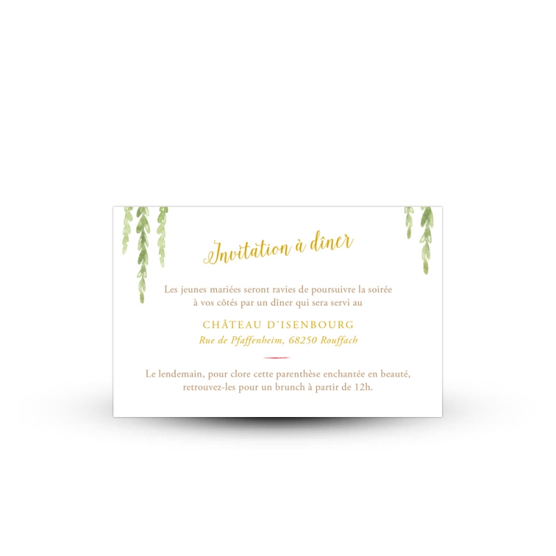 Accompagnez votre faire-part de mariage bohème d'une invitation repas assortie. Ce carton supplémentaire à superposer à votre invitation principale est également illustrée de fleurs colorées peintes à l'aquarelle.