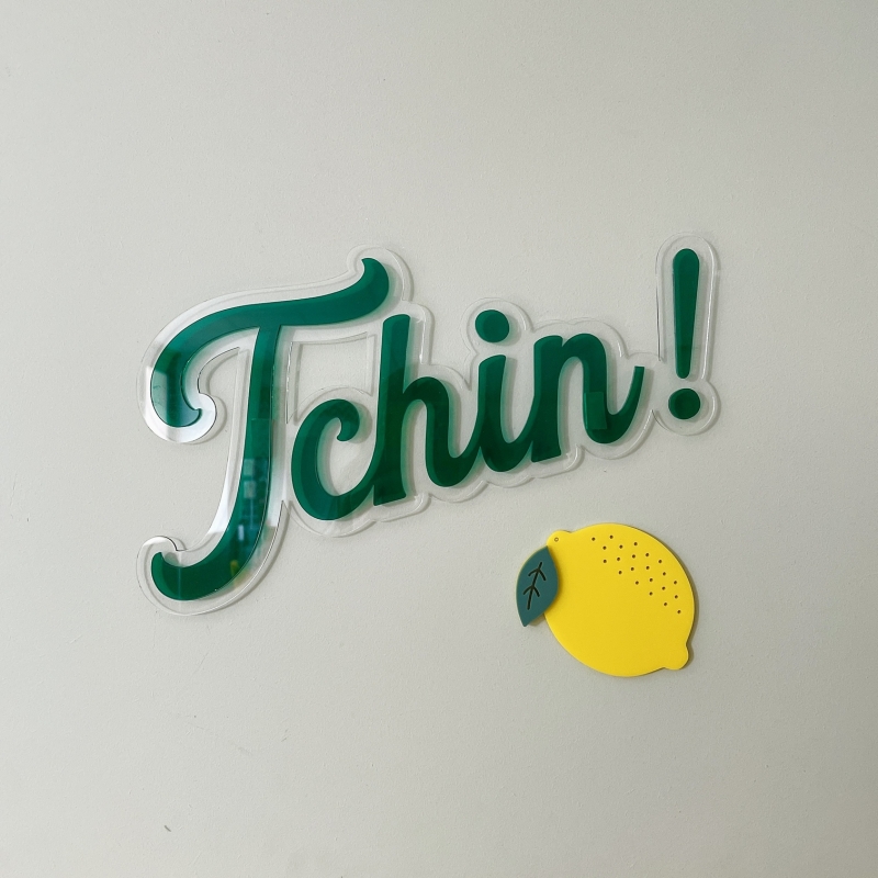 Chouette enseigne style néon en plexiglas pour vos événements ou votre terrasse avec le message "Tchin!". L'enseigne murale est à personnaliser avec le coloris de votre choix pour coller à 100% à votre décoration.