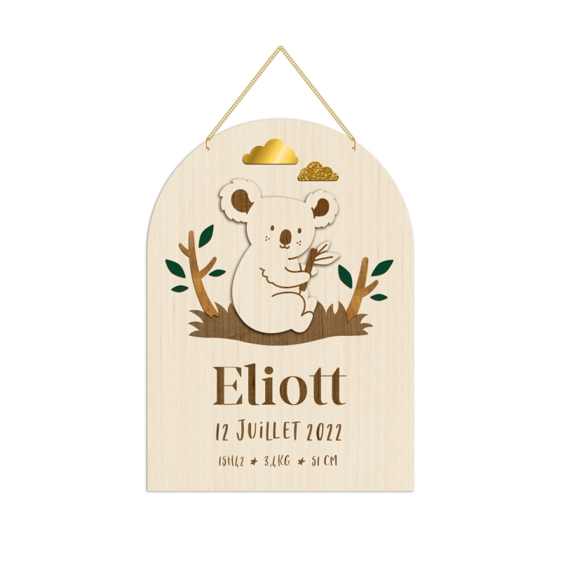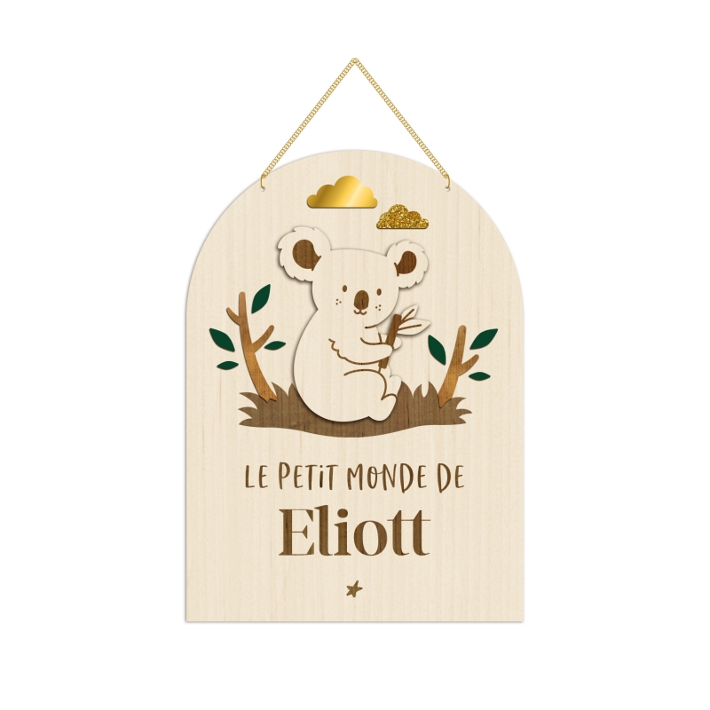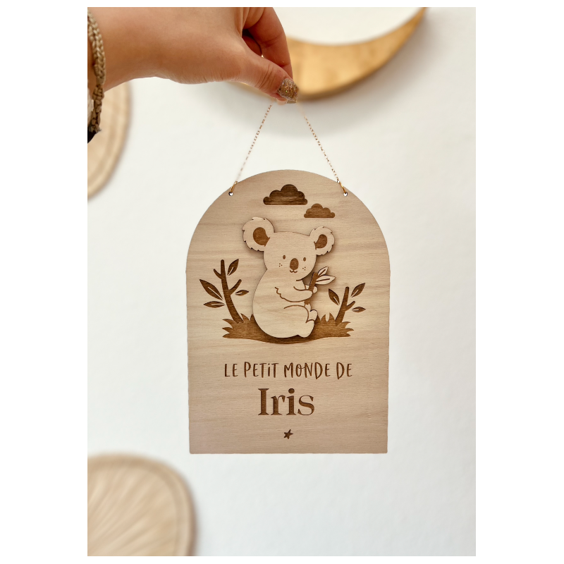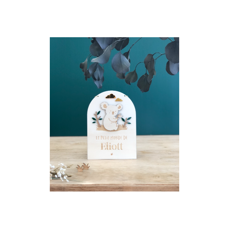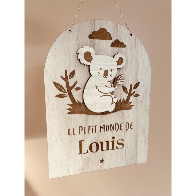 Jolie pancarte en bois illustrée avec un petit koala dans son milieu naturel. La décoration murale est personnalisable avec les informations de naissance ou la mention "Le petite monde de" ou "Bienvenue chez" pour être suspendue à une porte ou dans la chambre de l'enfant.