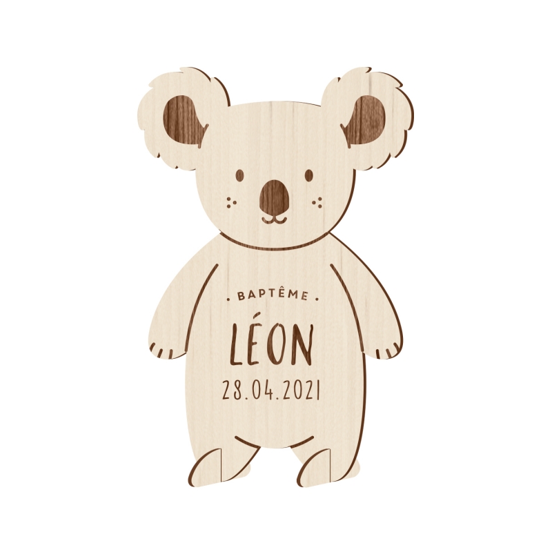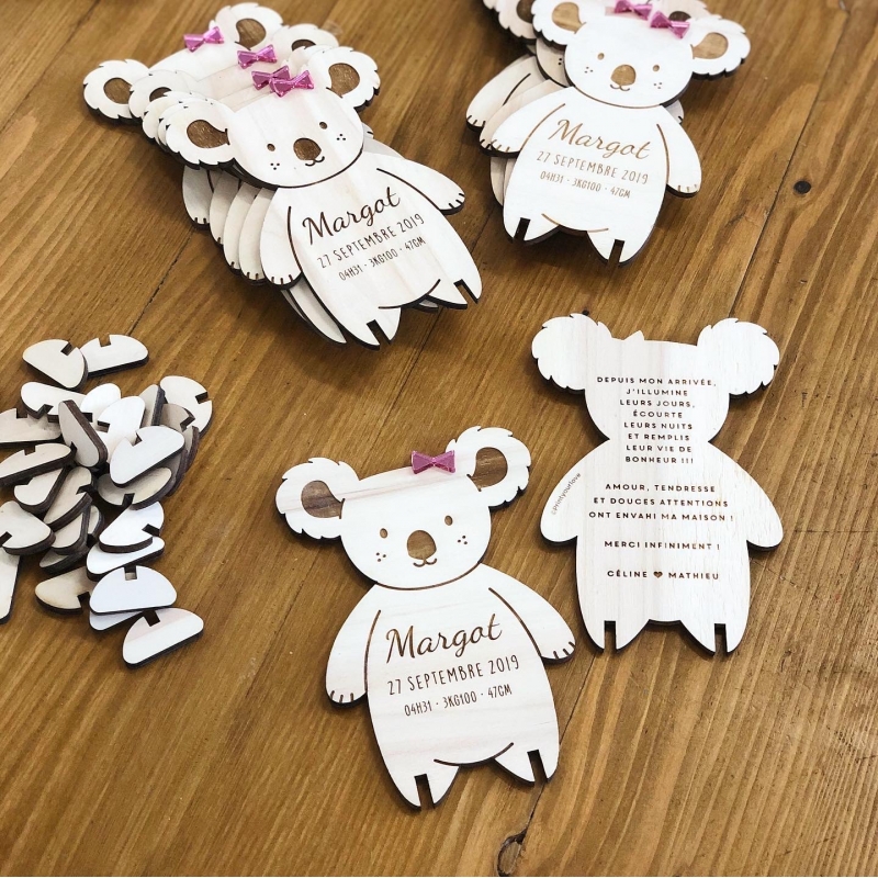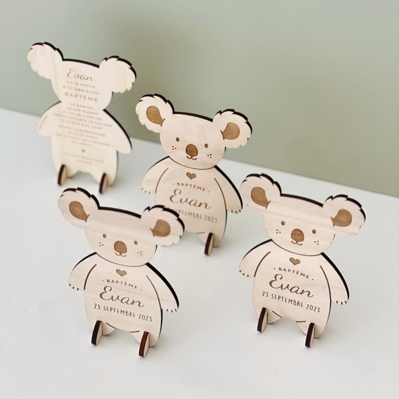Vous cherchez un joli faire-part de baptême qui sort de l'ordinaire ? Vous allez être forcément séduit par ce faire-part en bois en forme de petit koala. Personnalisez-le à 100% en lui ajoutant un accessoire de la couleur de votre choix et en changeant la police selon vos préférences.