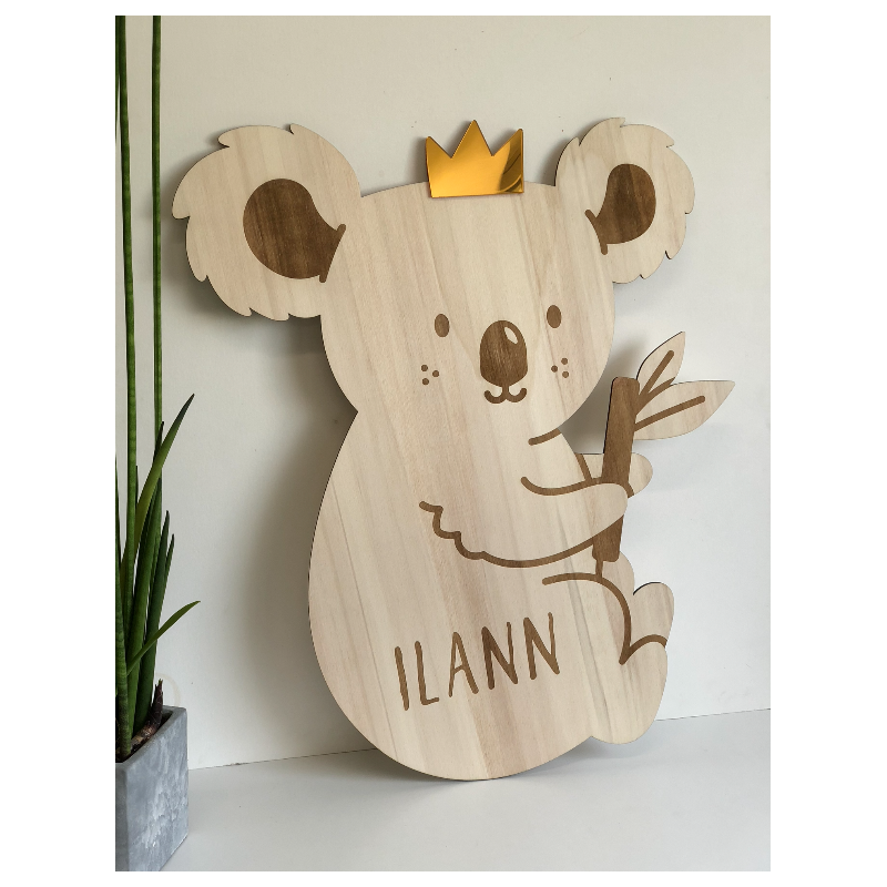 Laissez-vous séduire par cette décoration originale en bois en forme de koala. Personnalisée avec le prénom de l'enfant, cette jolie enseigne murale donnera du cachet à votre décoration. Elle peut être accrochée dans une chambre ou décorer le lieu de cérémonie de son anniversaire ou son baptême.