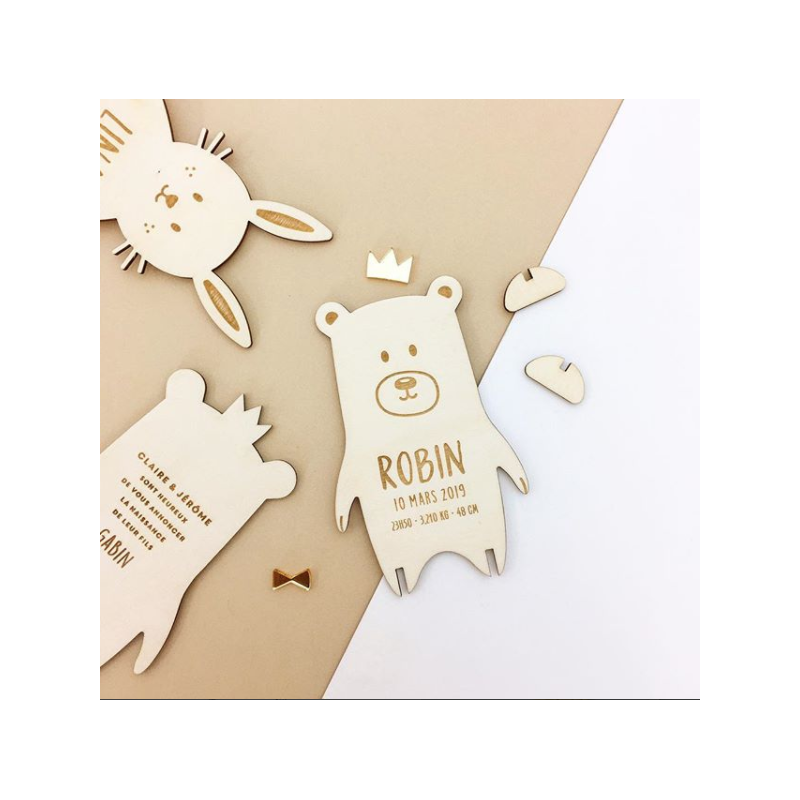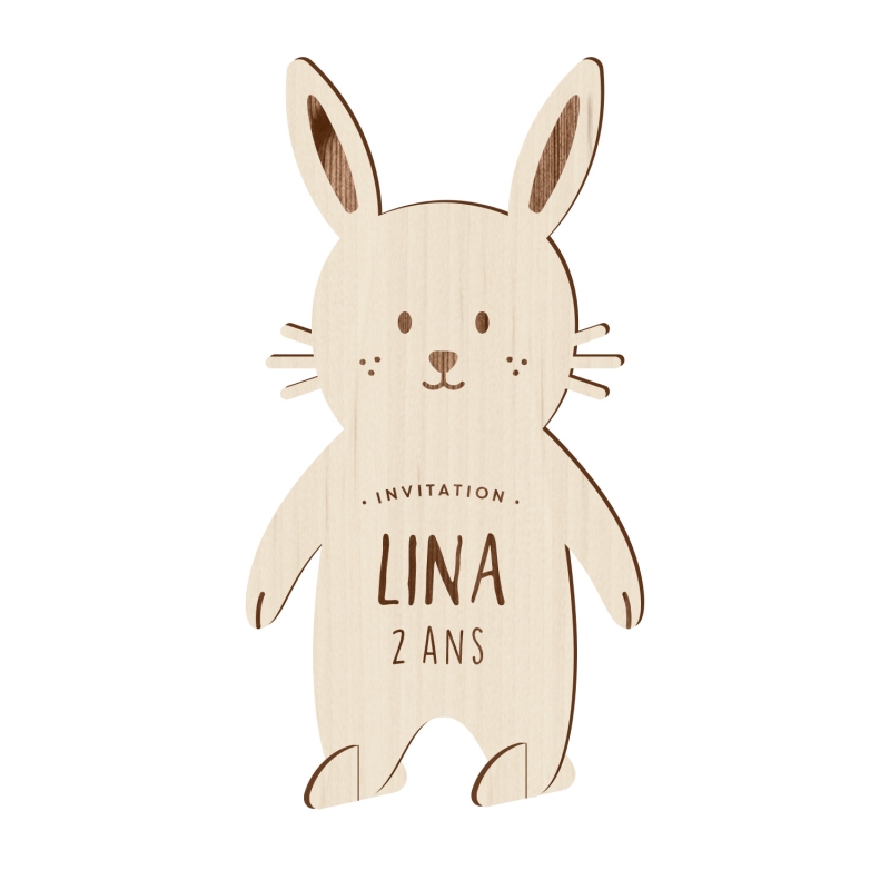 Cette invitation pour anniversaire en forme de petit lapin est découpée dans du bois brut clair, puis finement gravée, ce qui lui confère un côté très originale qui plaira beaucoup à vos invités.