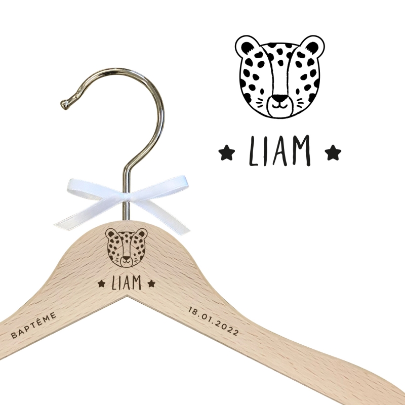 Cintre enfant en bois à personnaliser avec le prénom de l'enfant. Vous allez adorer ce modèle avec sa petite tête de léopard, parfait pour un thème safari ou jungle. Un cadeau original et personnalisé à offrir pour une naissance, un baptême ou un anniversaire.