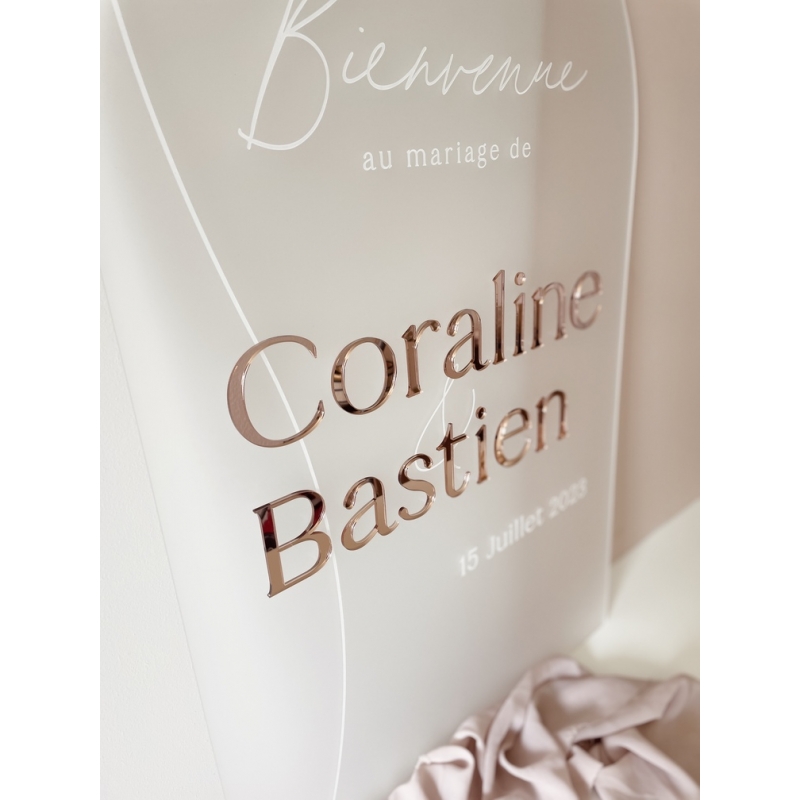 Succombez au charme de ce magnifique panneau d’accueil en plexiglas ou en bois pour votre mariage. Vos prénoms de mariés sont joliment mis en valeur par le relief des lettres. De son style minimaliste, ce panneau de bienvenue introduira le thème de votre mariage et sera un élément de décoration clé pour votre salle de réception.