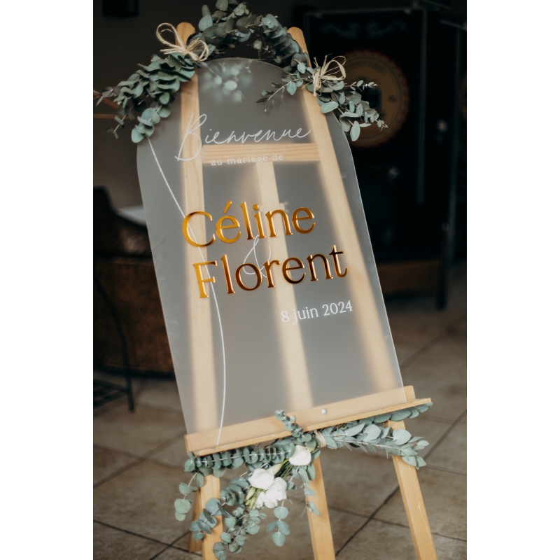 La commande du panneau comprend la personnalisation avec vos prénoms et la date de votre mariage, ainsi que sa fabrication. L'option finition "Ajout de plexiglas" est disponible si vous souhaitez mettre en lumière vos prénoms grâce à une application de plexiglas (en option).
