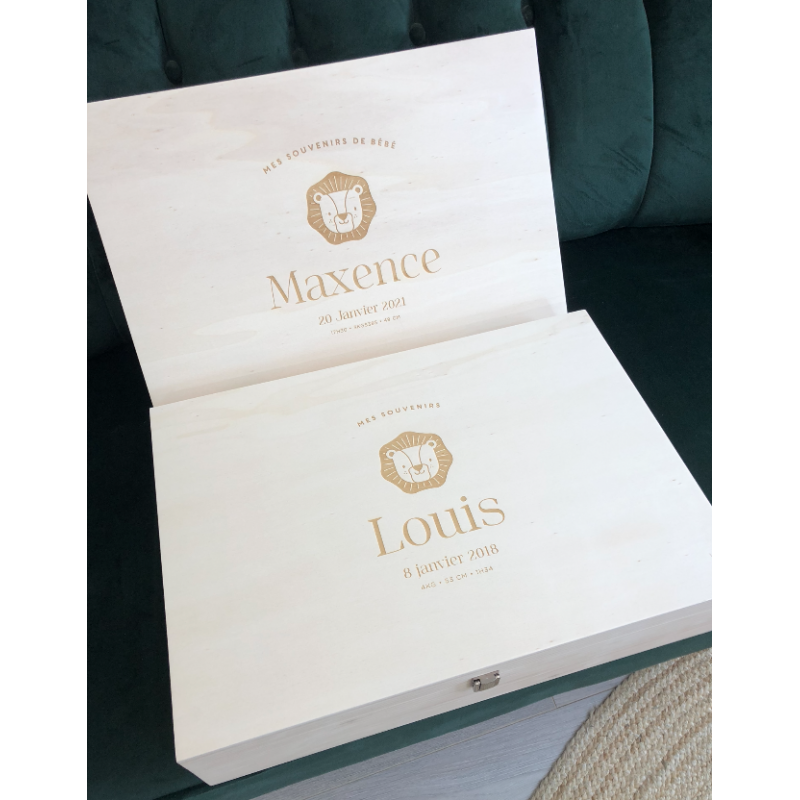 Personnalisez ce joli coffret de naissance en bois avec les informations de naissance de votre bébé. Grâce à lui, vous pourrez conserver précieusement les premiers vêtements et accessoires de votre enfant. Le modèle lion sera parfait pour les adeptes de la savane !
