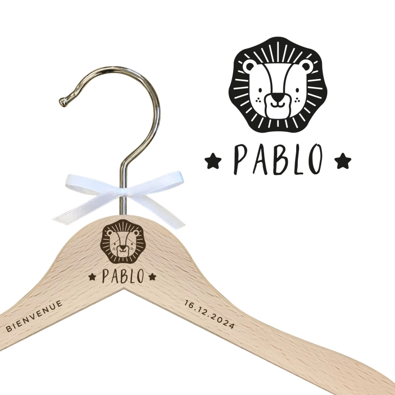 Joli cintre enfant en bois à personnaliser avec le prénom de l'enfant et illustré avec une tête de lion