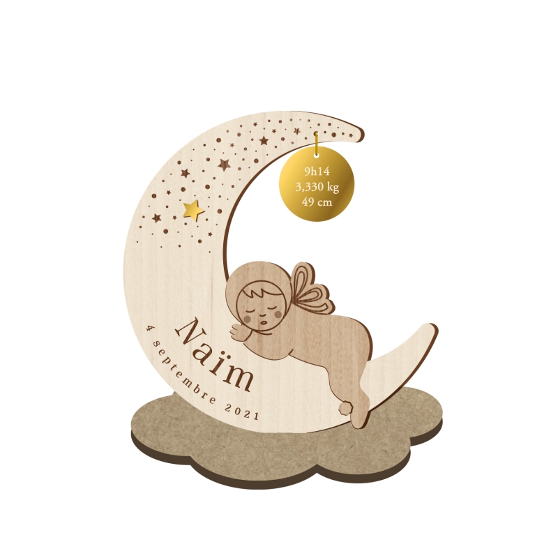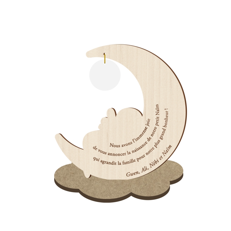 Le faire-part se présente sous forme de kit de 2 pièces (la lune (bois peuplier) avec le bébé (bois plaqué érable) en faire-part et le socle nuage (bois médium)).