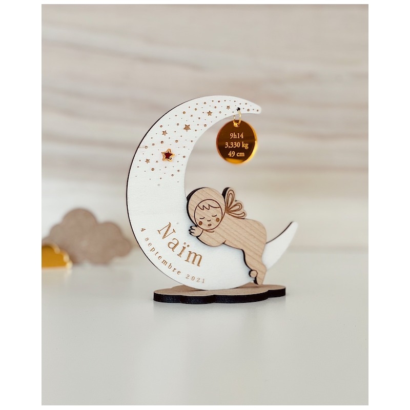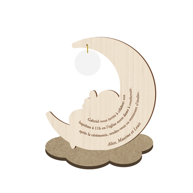 Le faire-part se présente sous forme de kit de 2 pièces (la lune (bois peuplier) avec le bébé (bois plaqué érable) en faire-part et le socle nuage (bois médium)).