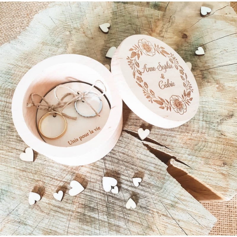 Chaque boîte peut être achetée avec un porte-alliances en bois personnalisé ou non. La commande comprend la gravure extérieure de la boîte (et celle du porte-alliances en option) avec les textes de votre choix.