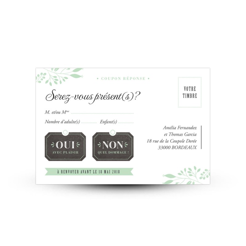 Grâce au carton réponse RSVP, vos convives pourront vous informer de leur présence à votre mariage d’une manière originaleSous forme de carte postale avec un emplacement pour le timbrele carton RSVP permettra à vos invités de vous donner leur réponse très facilement : ils n’auront qu’à cocher la case « Oui » ou « Non », à indiquer le nombre de personnes présentes et à poster le carton.