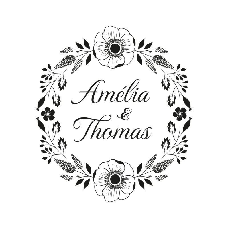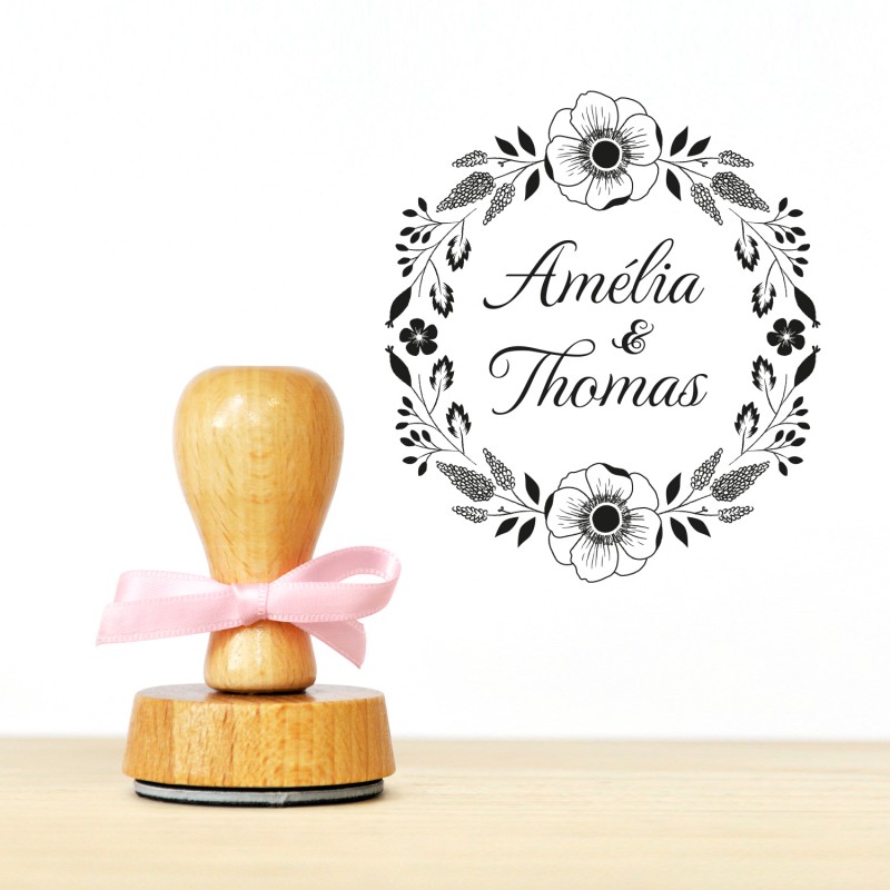 Pour votre mariage champêtre, personnalisez un tampon encreur illustré d’une couronne de fleurs estivale et ces deux anémones. Votre tampon sera un vrai fil rouge tout au long de votre mariage : de l’invitation à la décoration