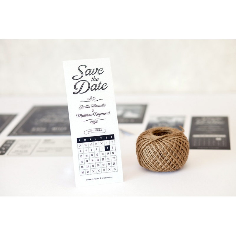 Ce modèle retro vous fera craquer avec ses illustrations tout droit sorties des journaux des années 20. Assorti d’un calendrier « mémo »il est idéal pour rappeler la date de votre joli jour à vos proches.