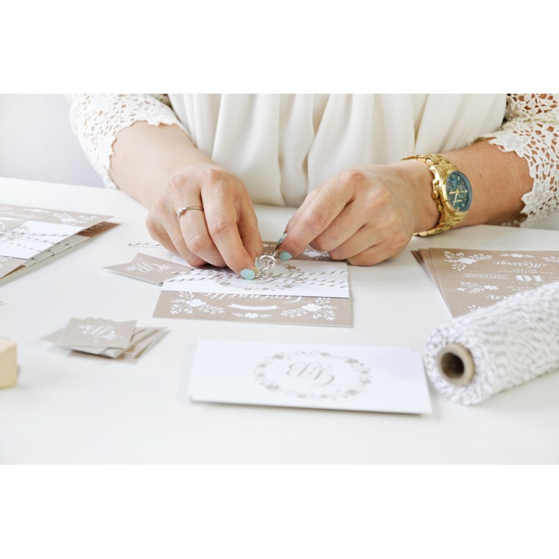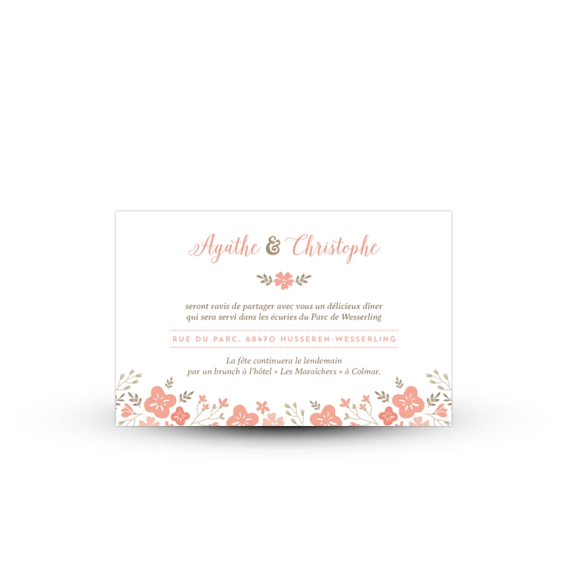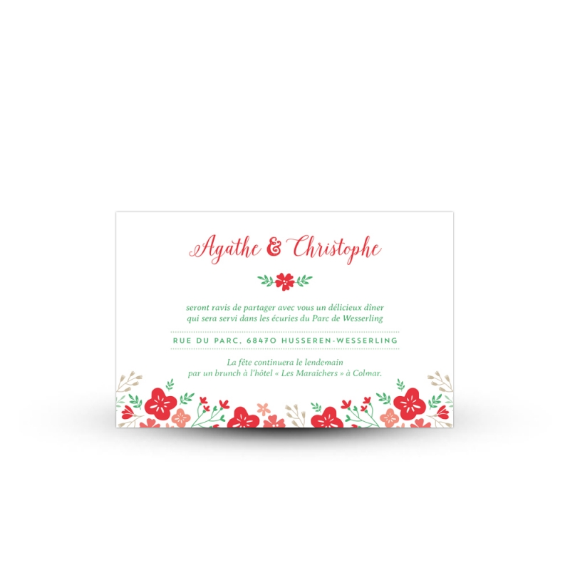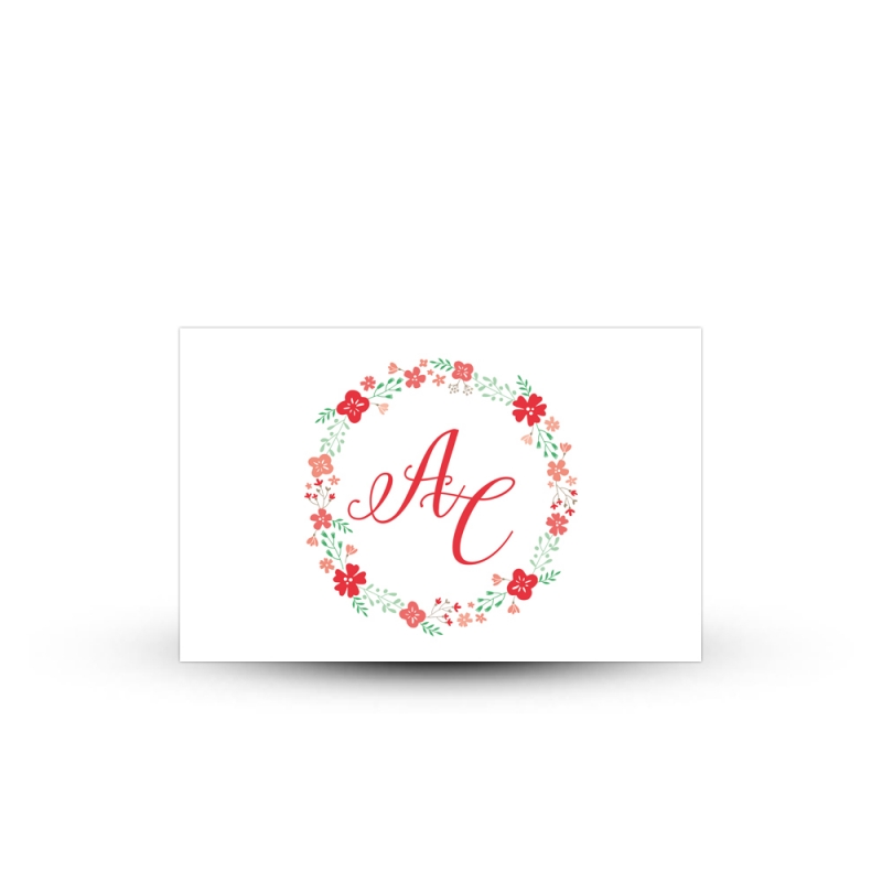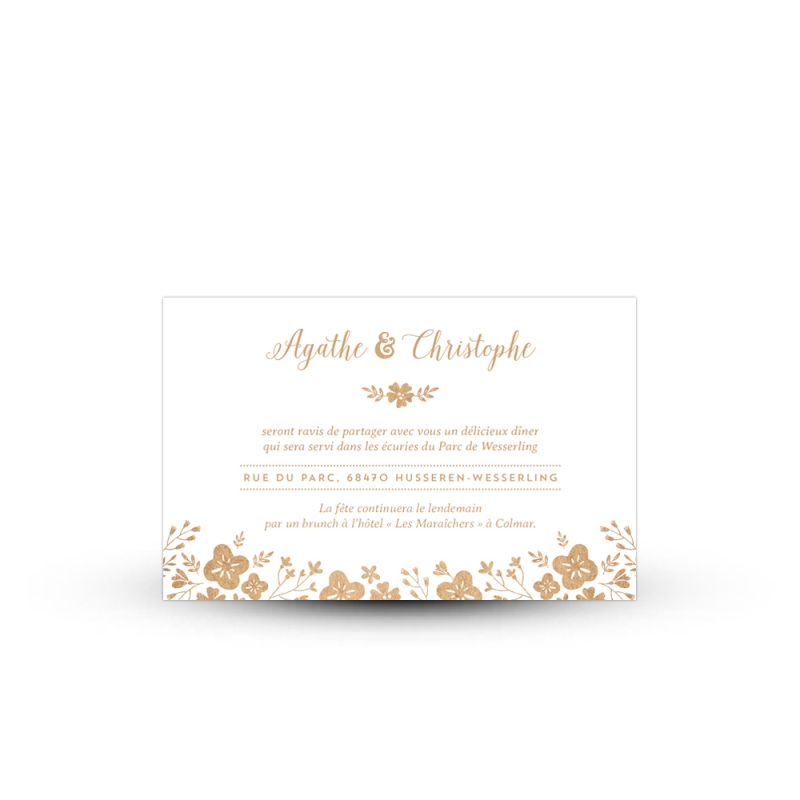 Glissez une invitation repas bucolique dans l’enveloppe de votre faire-part de mariage. Avec sa couronne de fleurs champêtre, ce carton repas se superpose parfaitement sur votre faire-part pour un effet bucolique des plus réussis !
