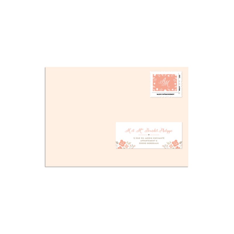 Personnalisez vos timbres postaux pour ajouter une touche personnelle et originale à vos enveloppes. Ce modèle est une déclinaison de la collection Jardin Champêtre pour que votre papeterie de mariage soit en harmonie parfaite du faire-part au timbre poste.