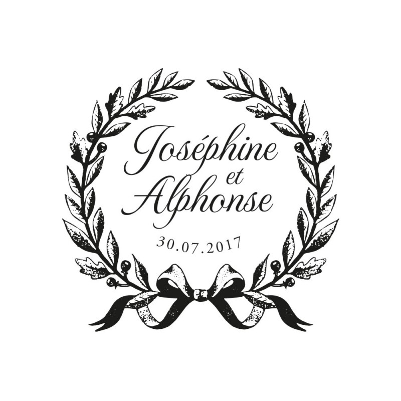 Orné d’un joli feuillage et de petites baies, ce tampon mariage est tout délicatement assemblé par un ruban à l’aspect vintage. Cette illustration fine est inspirée de gravures anciennes sur le style Shabby Chic. Choisissez de mettre vos prénoms ou vos initiales à l’honneur dans cette couronne vintage.