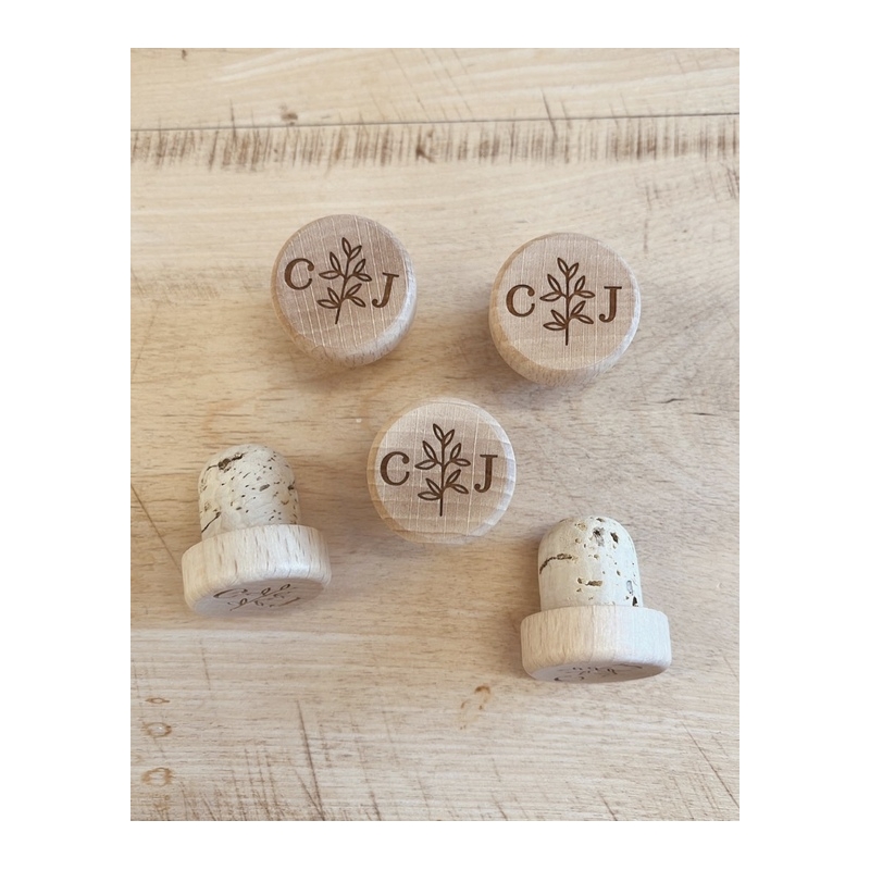 Bouchons de bouteille en bois et liège à personnaliser pour votre mariage. Ce modèle vous plaira avec son petit brin de laurier au milieu de vos initiales. Un cadeau original et utile dont vos proches pourront se servir au quotidien. Un souvenir de votre joli jour insolite !