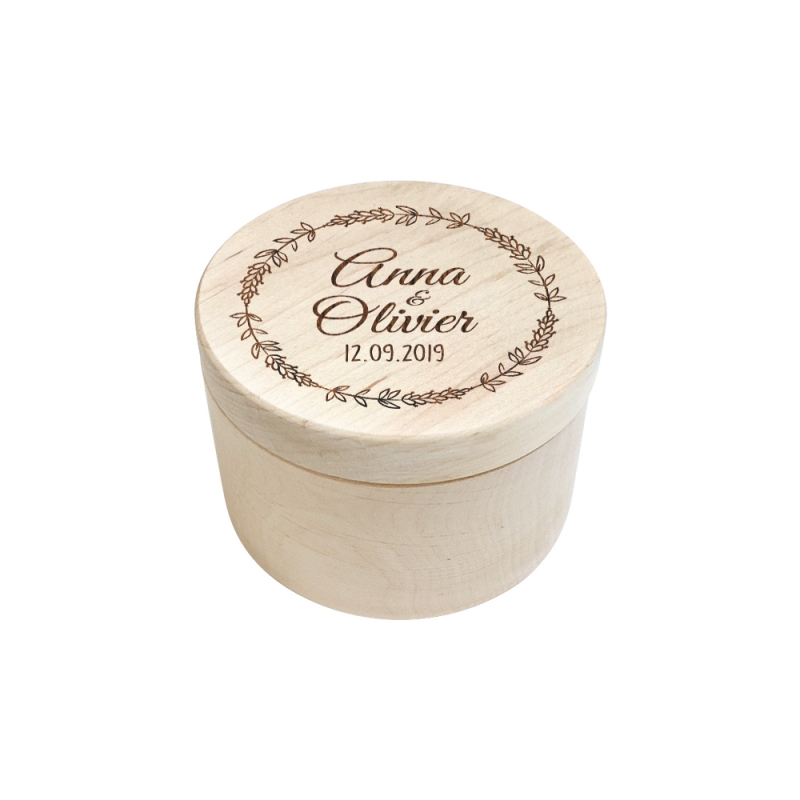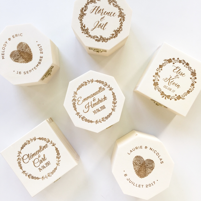 Chaque boîte peut être achetée avec un porte-alliances en bois personnalisé ou non. La commande comprend la gravure extérieure de la boîte (et celle du porte-alliances en option) avec les textes de votre choix.