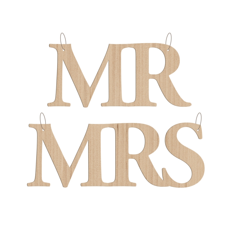 Pour votre repas de mariage, personnalisez vos chaises de jeunes mariés avec des pancartes en bois. Chaque panneau est finement découpé au laser dans du bois clair pour un résultat des plus élégants ! L'un pour madame (Mrs), l'autre pour monsieur (Mr), suspendez fièrement vos pancartes à vos chaises !