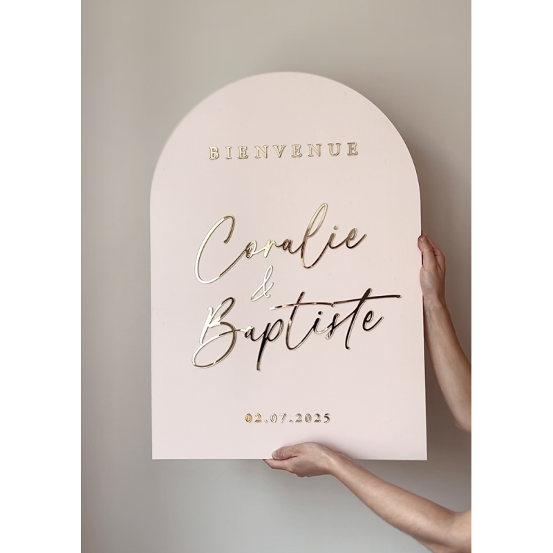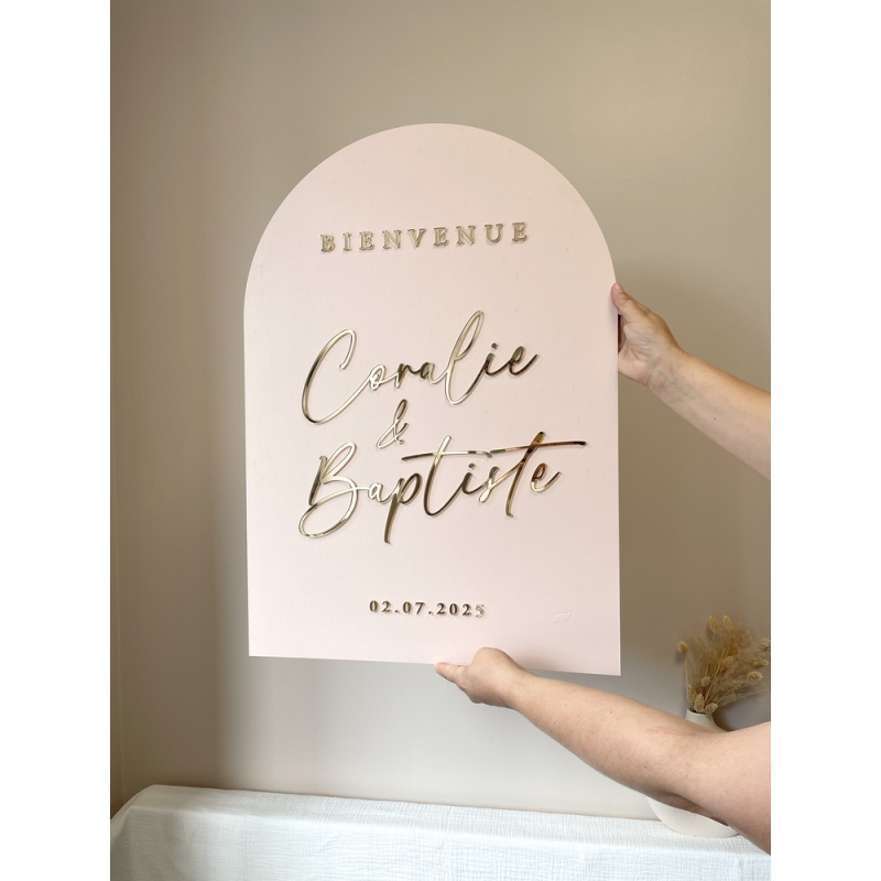 Décorez votre lieu de réception de mariage avec ce joli panneau de bienvenue en bois peint. Vos prénoms et la date de votre mariage sont mis en valeur grâce au plexiglas miroir champagne, pour un rendu classe et haut de gamme.